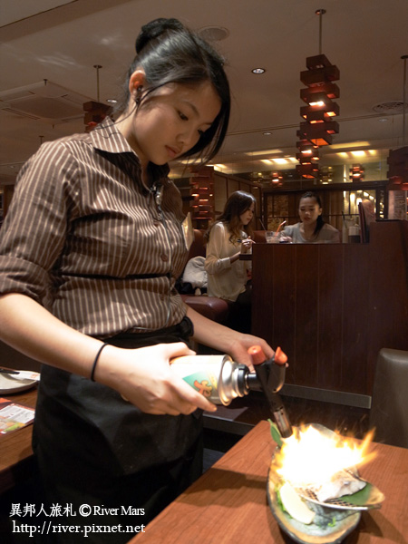 這道菜原本上桌時是一道生食,經過服務員在食客面前拿瓦斯槍炙燒,