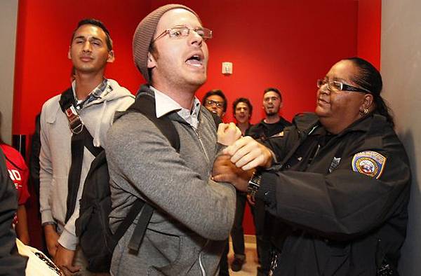 (圖中)主持抗議行動的學生艾瑞克布朗克(Eric Blanc)