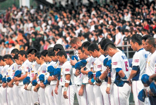 (圖)義大犀牛隊總教練徐生明過世,昨天中職兩場比賽開打前都進行默哀,犀牛隊球員更是不捨。聯合報記者楊萬雲/攝影